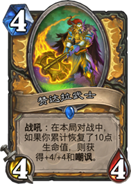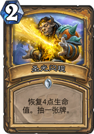 先来看一下卡组中加入的新版本新卡,这是圣骑士白卡:圣光闪现,恢复4点生命值。抽一张牌。 这张卡配合奶骑新牌赞达拉武士增加血量回复还是很不错的,相比较2费能奶6能抽牌就不亏,在快攻面前不会太过局促,在面对后期职业时能找齐需要的卡牌。