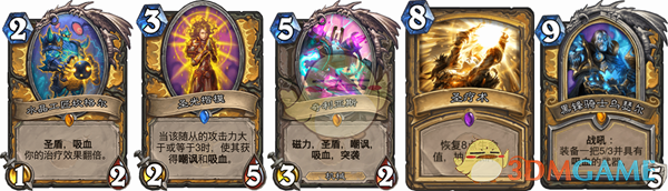 这套卡牌吸血足够,可以用水晶工匠砍格尔,圣光楷模,奇利亚斯,圣疗术和DK来奶自己,从而打出488的嘲讽,还是比较容易的。打中速的卡组是有优势的。