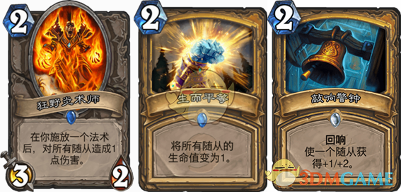 狂野炎术士加生而平等,也是很常见的圣骑士解场方式,不管对面的怪血量多大都可以清空,这里我们再加入了一张敲响警钟。在有敲响警钟的时候,可以贴在炎术士上进行清场,打法的顺序是狂野炎术士+敲响警钟+生而平等,这样即使对面有圣盾的怪,我们也可以先给炎术士加生命值后破圣盾,再把生命值降为一后清场。同时敲响警钟也能用来加buff增强小姐姐最后的攻击力。