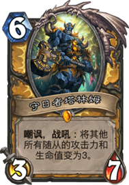 守日者塔林姆,最大的作用是控场,打靠大型生物压场面的卡组有奇效,打偶数术招募猎等卡组都很强,同时也能强化自己的小兵。