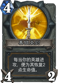 真银圣剑,俗称大保健,骑士神卡,对战奇数贼起手必留的一张卡牌,可以吃掉3费单刷龙和暴徒,在前期苟活稳住场面,同时也可以回血,有了它轻松度过中期。