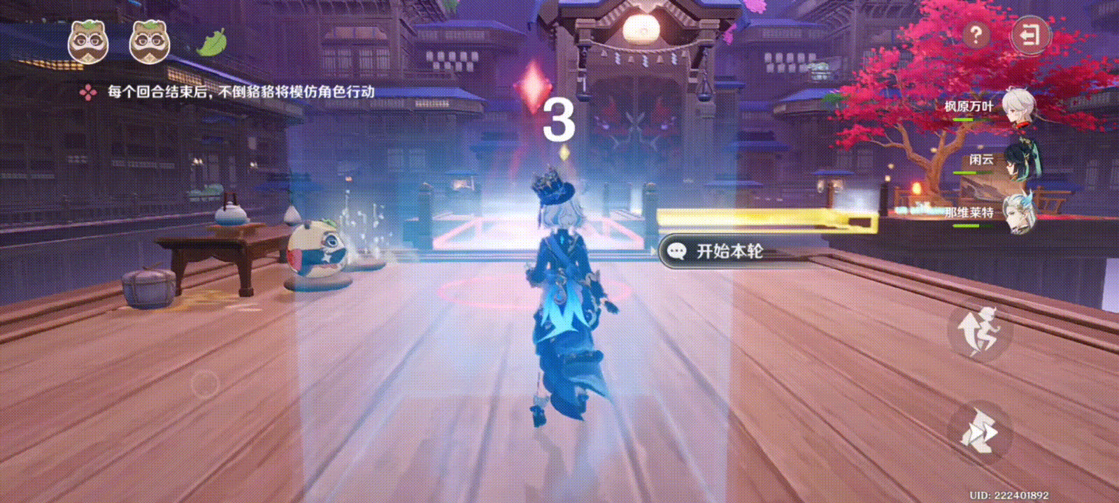 您进来之后,先点击右下方的这个开始行动,然后点击开始本轮,然后您要站到前方这个红圈里面(为了触发桥梁,后同)。然后左上方这里有个提前结束本回合,点一下。