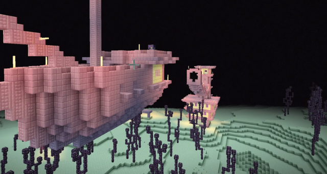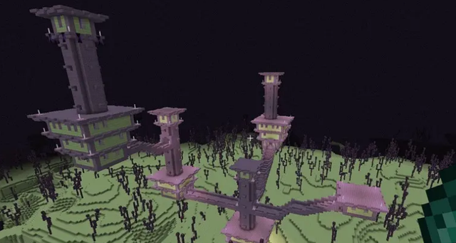 可能会生成成一个单独的塔,或一个庞大而复杂的跨越连接的塔,在某些房间里,(通常在高耸结构的顶部)有箱子和一些末影箱,装饰性的紫珀楼梯从塔的两侧突出,塔的外沿会有一些旗帜,楼梯会彼此连接多个塔。