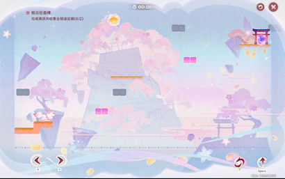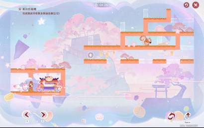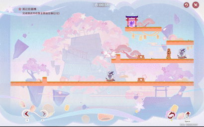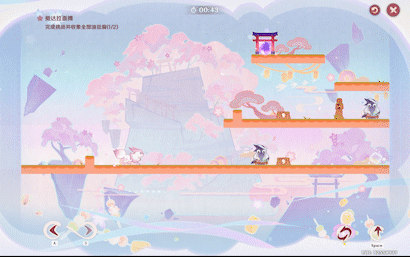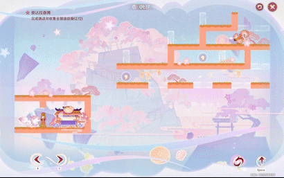 往右走踩上中层的勾玉板——>入梦,等待底层敌人走到与小狐狸此时位置的一条直线上——>出梦,等待障碍解开——>入梦,等待中层敌人走到可以当作跳板的位置——>出梦——>前往传送门