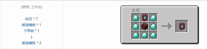 锻造模板(Smithing Template)可在锻造台上与钻石装备和下界合金锭相结合,将其升级为对应的下界合金装备。