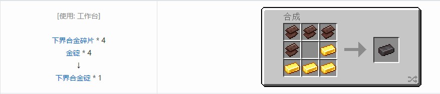 下界合金锭是原版游戏中最稀有的锭,由下界合金碎片和金锭合成获得,用于制造下界合金工具、武器和盔甲。