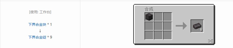 下界合金制品可以用下界合金锭在铁砧上修复,一个下界合金锭可以使耐久值恢复约 25%(修复的耐久度向下取整)。