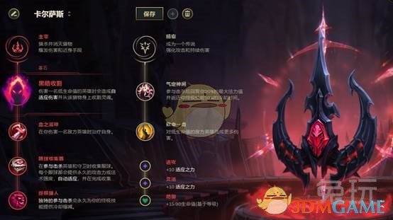 符文上同样点出气定神闲与终极猎人的减CD符文组合,以黑暗收割搭配致命一击,其他符文均选择标配点法,附加符文则重点点出20的适应之力。