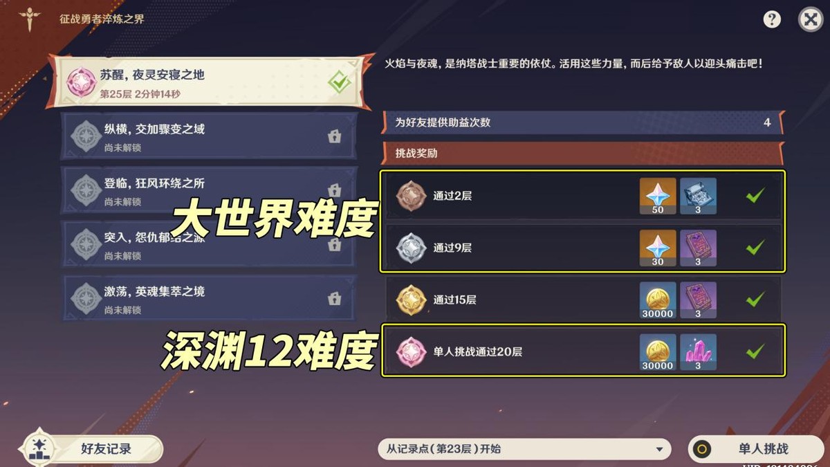 新活动「征战勇者淬炼之界」开启!此玩法可以用一句话概括‘间均30秒闯25层’,对于仅关注奖励的玩家而言,原石奖励仅需通过第9层(大世界锄地水平),满奖励也只需要20层(深渊12层水平)。
