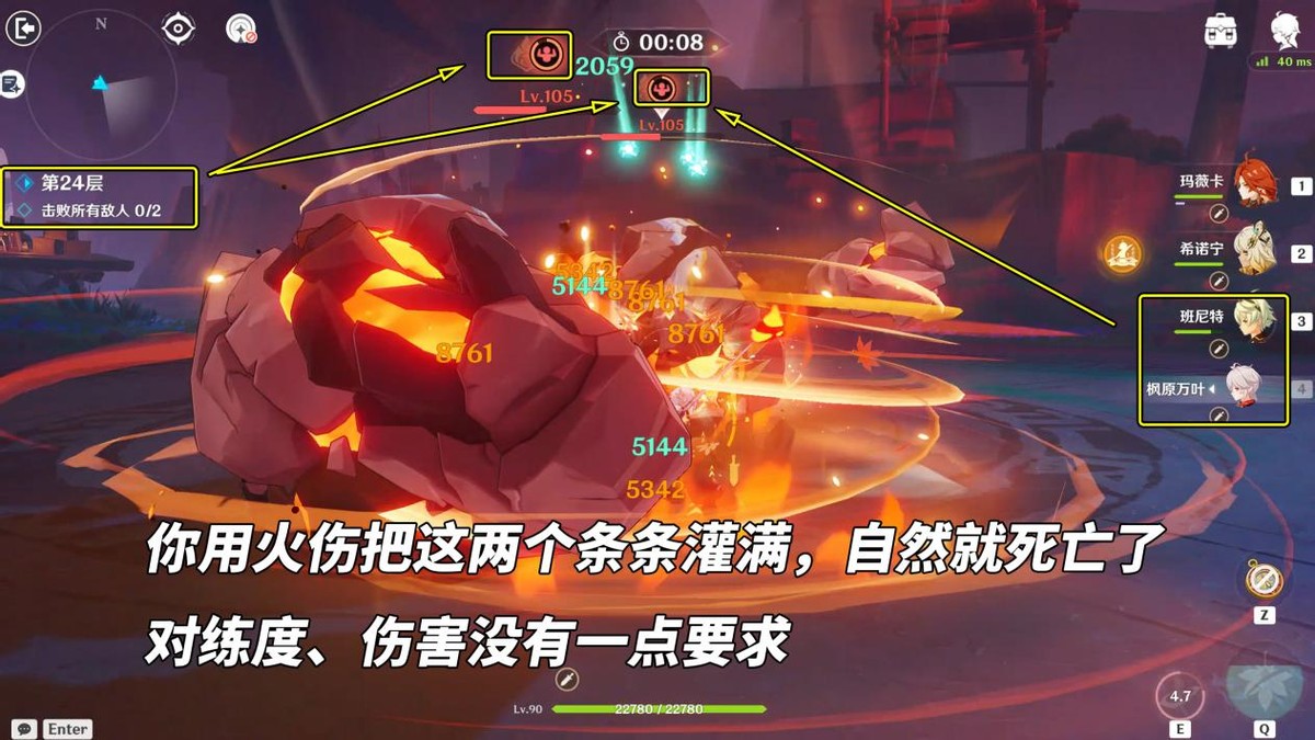 ※这是绝大部分玩家采用的24层逃课方案,无需练度,配队带个‘班尼特+琴/万叶/砂糖’,一直附着火伤让这两个怪自然死亡即可。强杀血量预估需要30秒输出1500万+,反正冻梨打不动,走机制过的……