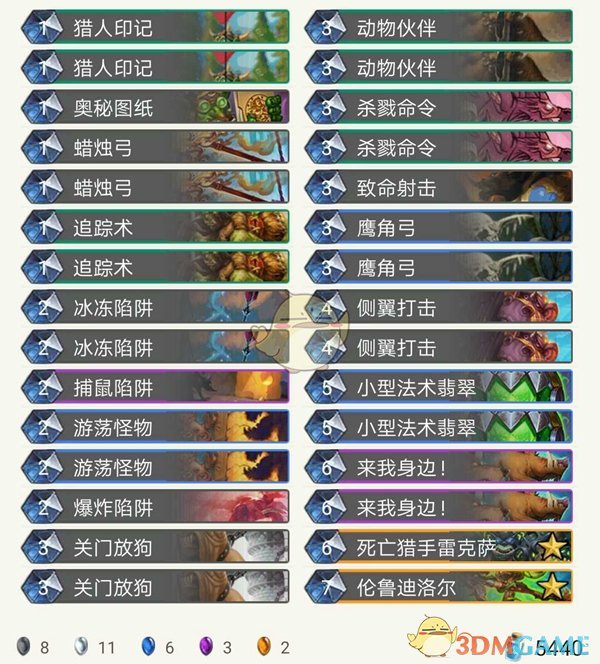 这是我在天梯中常用的法术猎卡组构筑,法术猎是一个抗快攻能力较强的卡组,缺点是面对慢速卡组前期进攻性略显不足。诱饵射击与侧翼打击一样,作为解场+返场的神卡,完全可以考虑替换掉一张奥秘牌或者致命射击。