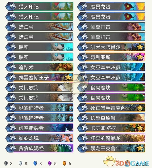 森林狼,111,使你的其他野兽获得+1攻击力,这张单卡在中速猎的卡组构筑里其实并不弱,之所以带的人不多是因为这张卡1费裸下太亏。但不得不说这张卡一旦配合场上的野兽或者放狗,可以打出爆炸伤害斩杀对手!在大乱斗版本有一张新卡“主人的召唤”,预计森林狼可能出现在纯野兽体系中速猎的构筑中。