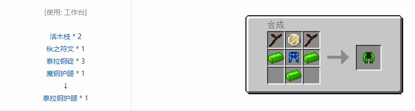 用泰拉钢锭合成,提供护甲值6点,盔甲韧性3点。耐久值510.不可堆叠。加3的击退抗性。
