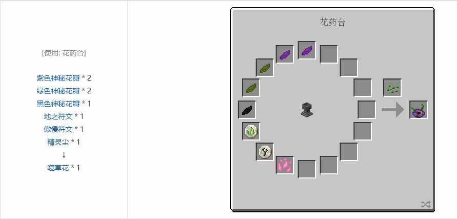 以通过吞噬合成的植物魔法花产生魔力,工作范围为以花为中心的 11 x 11 x 11 的正方体区域。每隔 2 秒检查一次,如果发现花朵,吞噬之,产生2100 魔力。