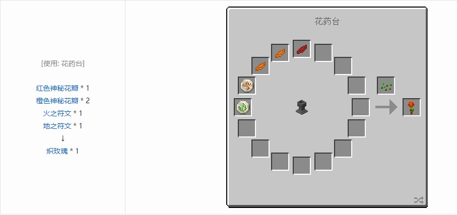 在燃烧时间未结束期间炽玫瑰开始产出魔力并暂时停止吞噬岩浆,结束后将进入冷却时间(Cooldown),冷却时间内若继续提供岩浆,炽玫瑰会吞噬岩浆源,但不产生魔力,并且会刷新冷却时间。