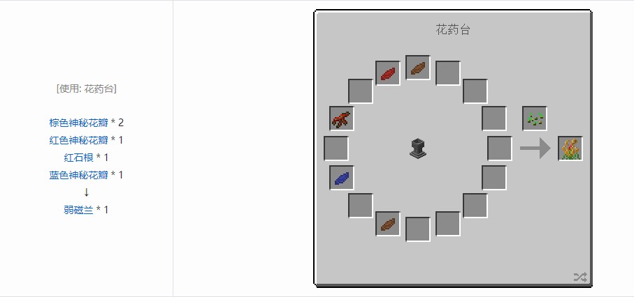将弱磁兰投入炼金催化的魔力池,可以合成小弱磁兰。小弱磁兰的范围为以花为中心的半径为 1 的球体。