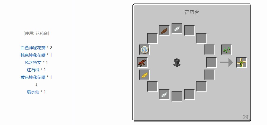 扇水仙可以通过耗费魔力使得前方的掉落物品往前水平移动,可以通过森林法杖指向扇水仙潜行右键来调整 4 种水平方向。