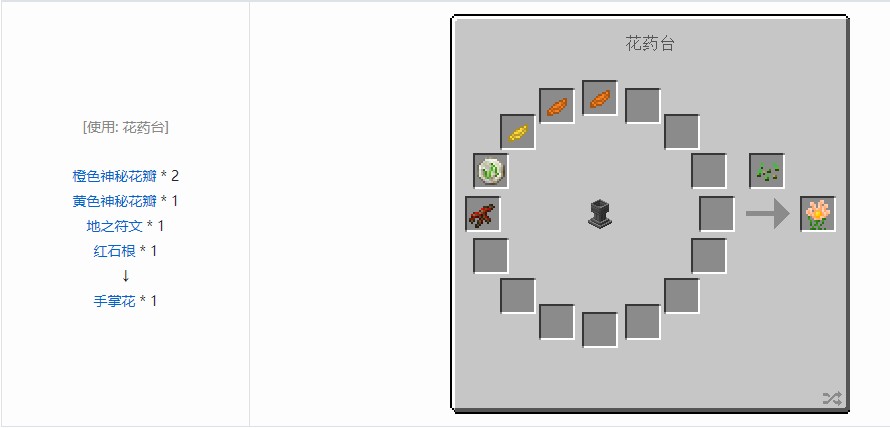 手掌花是一个植魔版的自动放置器。它会拾取附近任何掉落物品形式的方块并放置在其他地方,且会优先将方块面对自己。