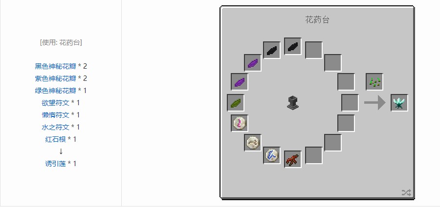 内部魔力缓存量为 500 mana ,每次阻止末影人瞬移,都将消耗 50 mana 。工作范围为以花为中心的半径为 64 的球体。