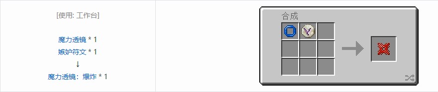 爆炸透镜会使魔力脉冲在击中无法接收魔力脉冲的方块时产生爆炸,爆炸强度为脉冲魔力量Mana/50,脉冲魔力量越大爆炸越强。
