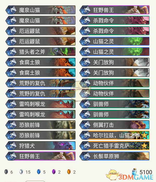 K神这套快攻猎带了猎人新的职业橙卡山猫之神,可以配合土狼,狂野兽王进行铺场。卡组里总共有13张野兽卡,所以驯兽师和雷鸣刺喉龙不会卡手,荒野的复仇配合放狗可以完美破解奇数骑的铺场,当我们发现前中期抢血不能抢死对手时,手里有DK就迅速变,毕竟猎人的DK一张卡就能打对手一个卡组,DK也解决了猎人后劲不足的缺点。