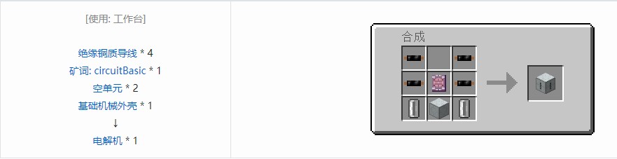 电解机是一种能用EU把水电解为其他物质(氢气氧气),缓慢地把电能转化为化学能并储存起来的机器,需要和电力储存设备(储电盒、MFE、MFSU)挨在一起放置,当旁边的储电装置电能储存超过70%时,会开始电解水储存能量,当储电装置电能小于30%时,会以燃料电池形式把化学能转化为电能并释放到储电装置中。用于储电装置的辅助存电,优点是不消耗钻石。