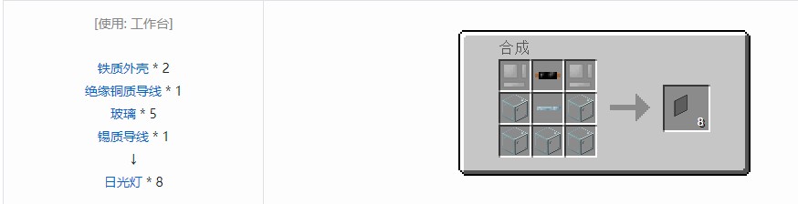 日光灯是一种需要输入低压电使其发光的发光体。它的耗电量为5EU/秒(即0.25EU/t),内部蓄电量为100,000EU,每充电一次可以持续发光4.8小时。