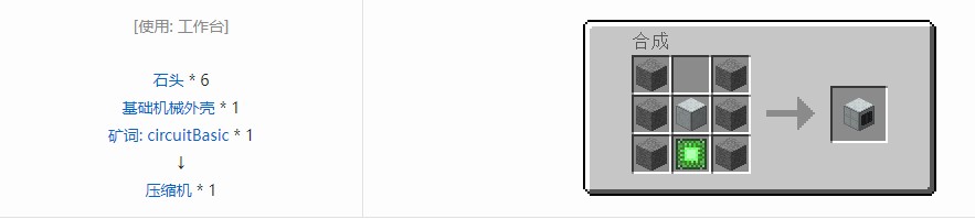 压缩机是一种压缩高级材料的机械。主要用于压缩碳板、合金板、冰等,无超频时工作功率2EU/t,压缩每个物品15s,即600EU的电力。