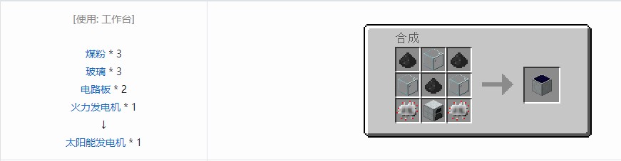 太阳能发电机是一种仅在白天工作的发电机。太阳能发电机只能在主世界使用,且正上方任何高度都不能有非透明方块阻挡。