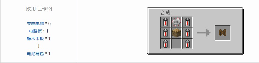 电池背包能够放在任何发电机或存电盒等存电设备中充电或为其充电,载电量为60,000EU。