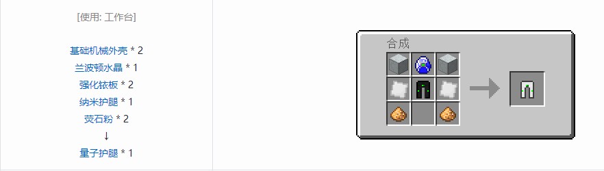 量子护腿是一种用电力损耗抵御伤害的装备,其单件具有两倍于对应钻石装备的防御