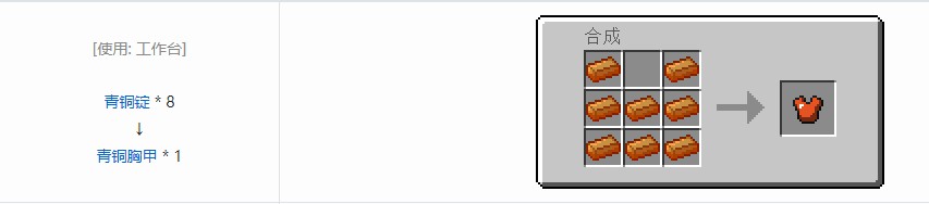 青铜胸甲是由[IC]青铜锭或[F]青铜锭合成而成的。一整套青铜甲耐久似乎低于铁甲,防御则与铁甲相等。
