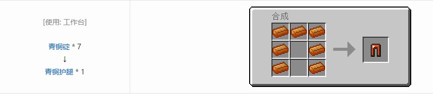 青铜护腿是由[IC]青铜锭或[F]青铜锭合成而成的。一整套青铜甲耐久似乎低于铁甲,防御则与铁甲相等。