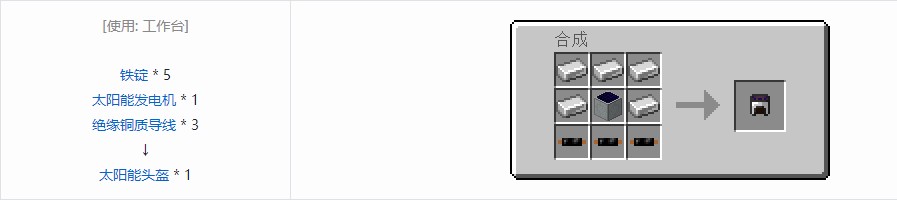 太阳能头盔能够补充充电背包与各种工具的电量,耐久度无限,每秒补充20EU(即1eu/t)。