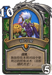 我们再看一下祖尔金的英雄技能,说实话我觉得很废,跟普通蝙蝠侠的技能比起来就是能解个随从,但是他与猎人DK比起来明显不是打后期的技能,如果是打慢速卡组10费后你觉得他的技能还有功夫打随从吗?如果是打快速卡10费之前就应该已经分出胜负了,所以我觉得如果英雄技能是打3的话还是不错的(可以同比同样是10费的术士DK)。
