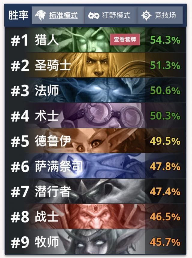 从目前来说“祖尔金”带来的影响远远比“哈加莎”和“砰砰博士”大得多,而这种影响力更是体现在了胜率上。我们可以看到猎人职业的胜率与其他职业根本不在一个等级,而且新的法术猎整体胜率高达67%。