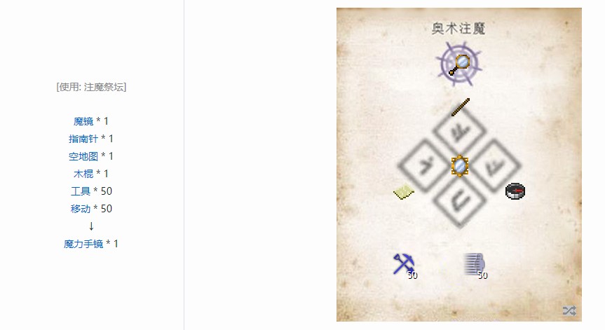 由于对魔力手镜使用右键默认为使用魔力手镜,所以注魔时只能用漏斗等方式放到奥术基座上。