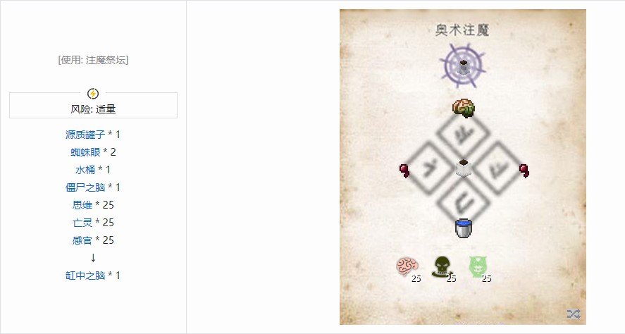 使用注魔祭坛合成缸中之脑,会给玩家增加扭曲值,如果不想体验扭曲debuff缠身,请勿批量合成,虽然它不算贵。