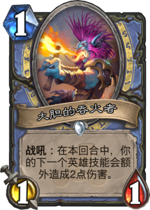 那么这一张就是加强英雄技能的牌了,本身只要1费,非常灵活,然后英雄技能当回合能打3点,要是有范围加成就更爆炸,就算没有也是不亏的。