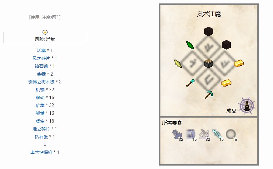 镐子的材质本身没有用处,但是其耐久可以影响钻探机的运行时间。为奥术钻探机基座提供红石信号来启动。