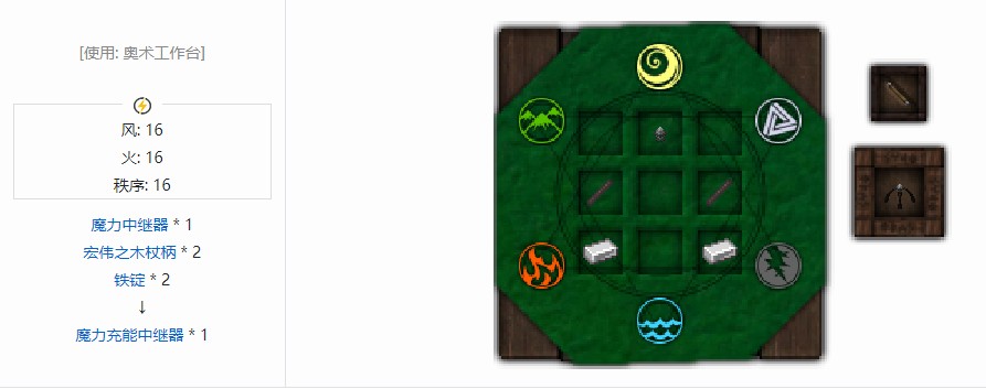 可以放在奥术工作台上方为工作台中的法杖充能,其余皆与魔力中继器相同。