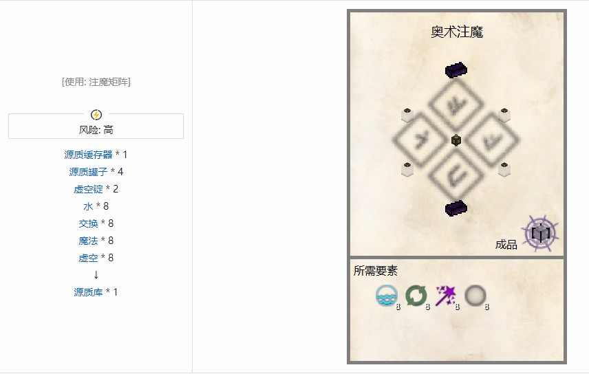 这个方块可以容纳256点任意类型、任意组合的源质,只能从管道或者使用傀儡进行输入/输出(傀儡只能输入源质),若破坏掉装有源质的源质库内部的源质则会以咒波瓦斯的形式释放,并且发生爆炸,源质全部丢失,但是源质库会掉落返还。