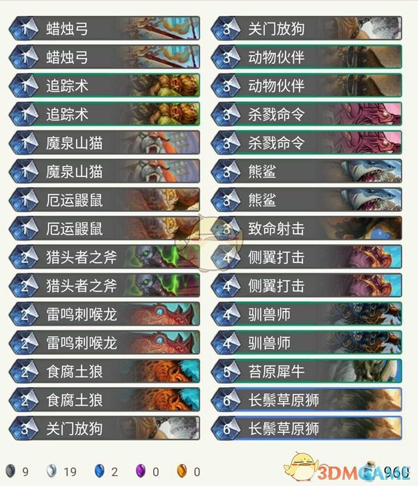 野兽T7猎,因为新武器猎头者之斧的加入,补充了重型刃弩退环境之后2费武器的卡位,1厄运鼹鼠2费雷鸣刺喉龙是一套猎人经典配合,凶鲨配合驯兽师能打出很高的伤害,狮子作为猎人最厉害的职业卡之一必须满编。