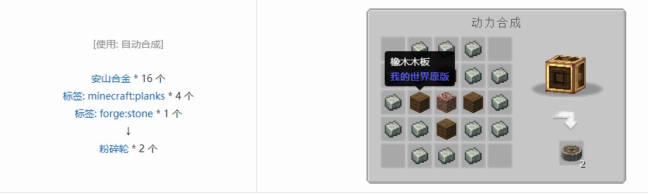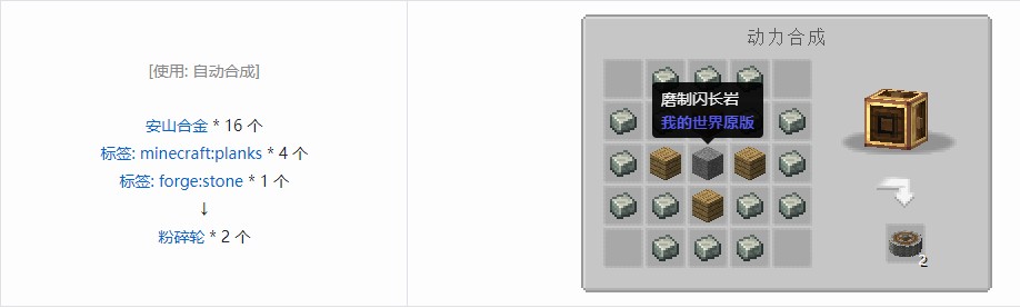 粉碎轮可用于进行“粉碎”与部分“研磨”类的配方,没有配方的物品会被直接销毁。