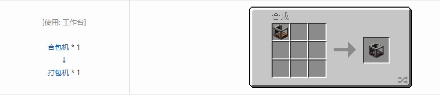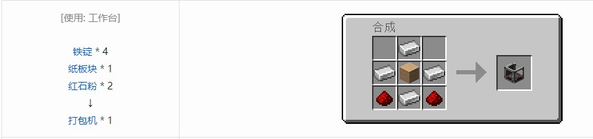 打包机需要依附在容器上工作。当接收到红石信号时,从容器内抽取最多 9 组物品封装成包裹,封装包裹不需要消耗额外材料。若容器内为包裹,则取出包裹可以通过漏斗、溜槽等物流元件输出或输入打包机。