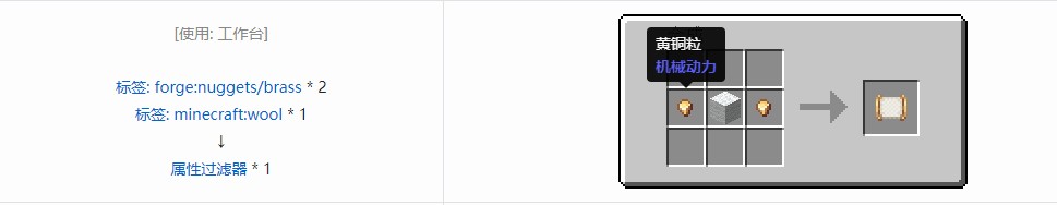 属性过滤器可以依据物品的一些“属性”进行过滤,相比一般的过滤器更加灵活,用于自动化加工中能获得比普通过滤器更智能的效果(普通过滤器仍不可被替代)。