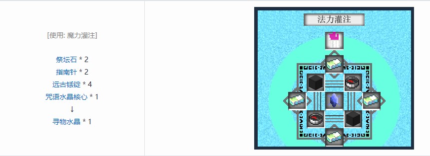 手持需要寻找的物品右击水晶,水晶就会用光束指出一定范围内所有包含该物品的容器,每次消耗50点魔法能。