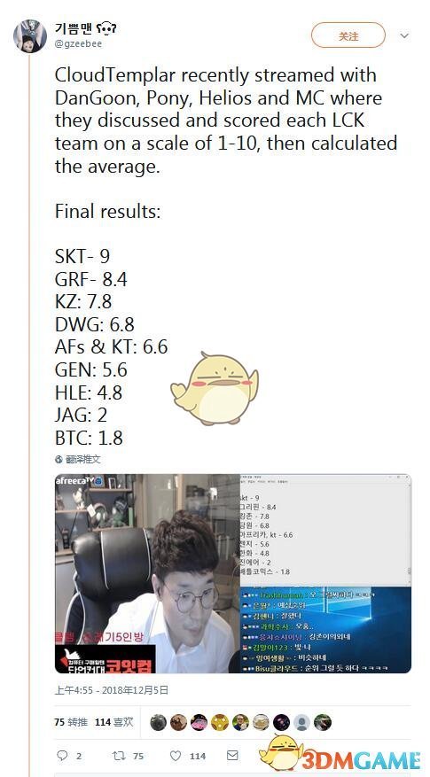 解说CloudTemplar最近在实况上跟DanGoon, Pony, Helios和MC 一起为新赛季的LCK队伍以1到10来评分实力。