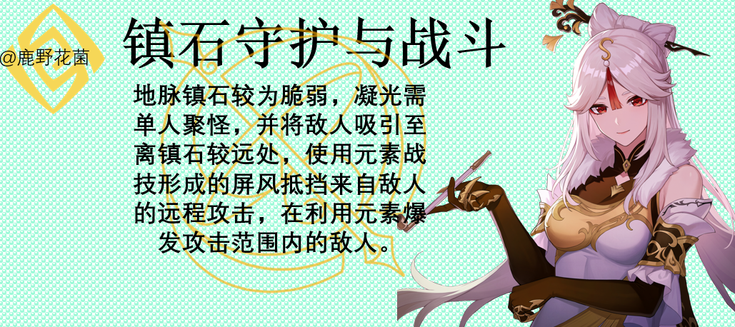 本次关卡的难度在于,地脉镇石较为脆弱,凝光需单人聚怪,并将敌人吸引至离镇石较远处,使用元素战技形成的屏风抵挡来自敌人的远程攻击,在利用元素爆发攻击范围内的敌人。