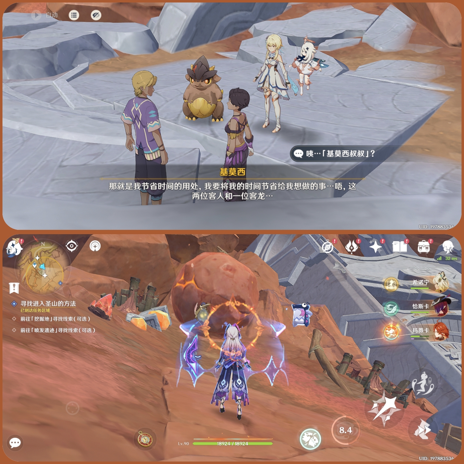 任务前引:旅行者和派蒙为了消除小龙的「焰主之祝」,寻找着进入图兰大火山的方法......